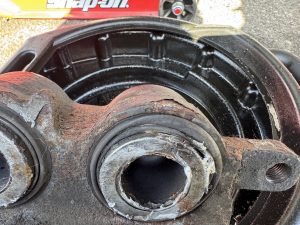 先日パッド交換でご来店頂いた際の左フロントのブレーキキャリパーピストンの変形を発見。